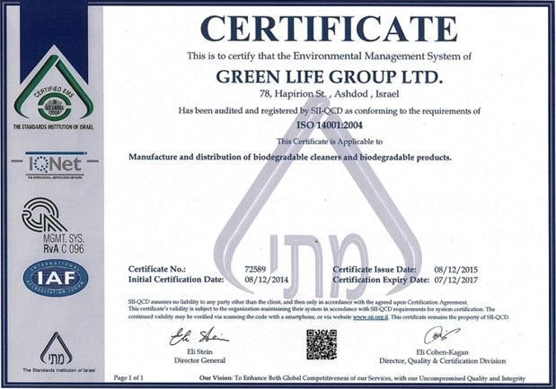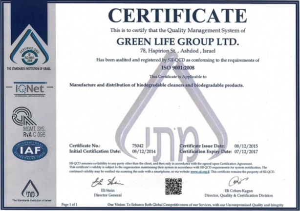Otorgado por The Standars Institution of Israel (Aplicable para Manufactura y Distribución de Limpiadores Biodegradables y Productos Biodegradables).